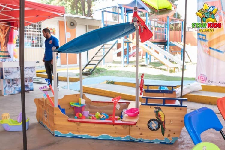 - Arenero de madera en forma de barco pirata (medidas: 199.4 x 112.4 x 151.1 cm)
